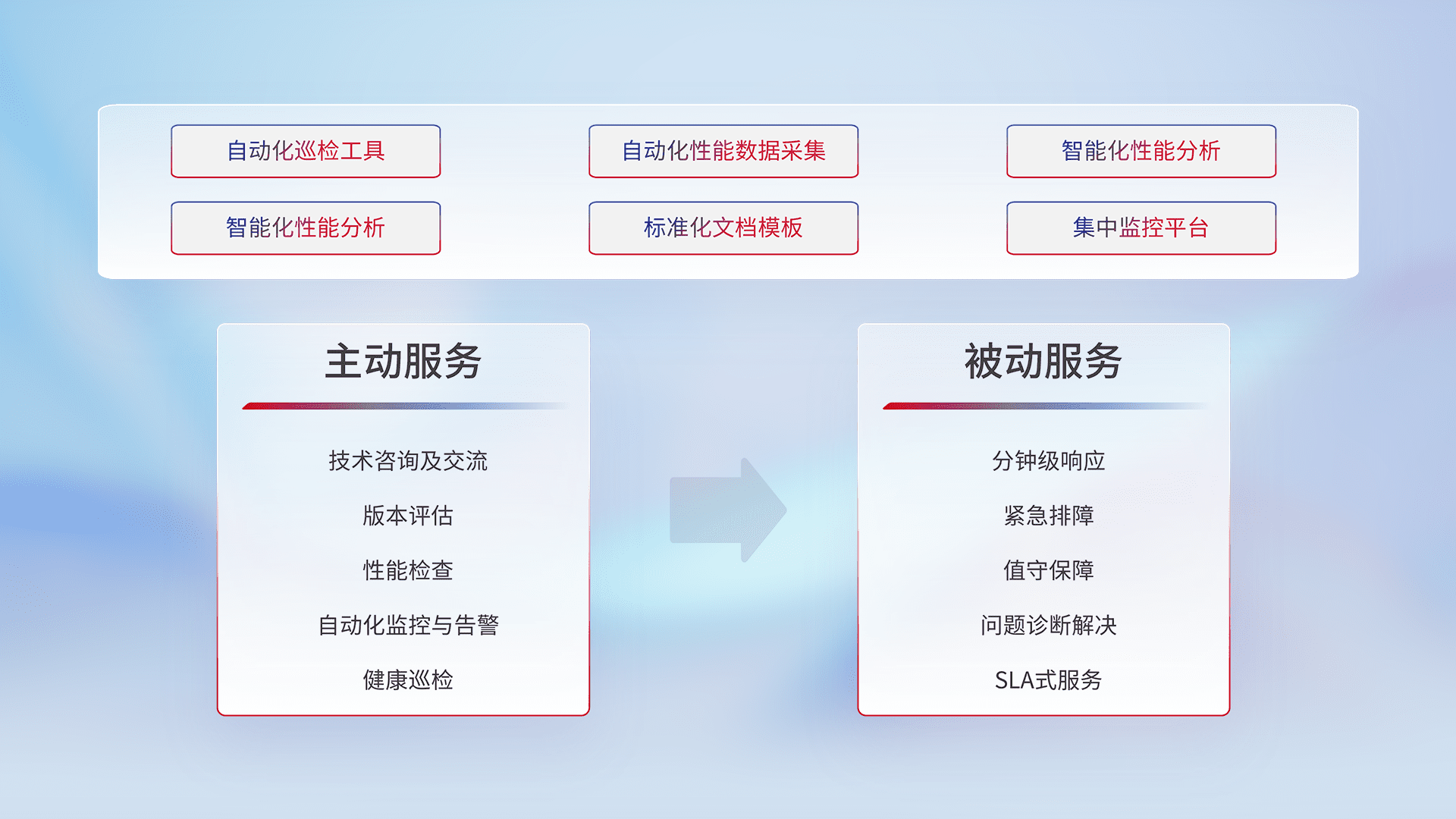 智能化工具和标准化文档,,保障服务质量,,,,提供主动服务(包含技术咨询、、版本评估、、、性能检查、、、自动化监控与告警、、、健康巡检)和被动服务包含(分钟级响应、、紧急排障、、值守保障、、、问题诊断解决、、、SLA服务)。。